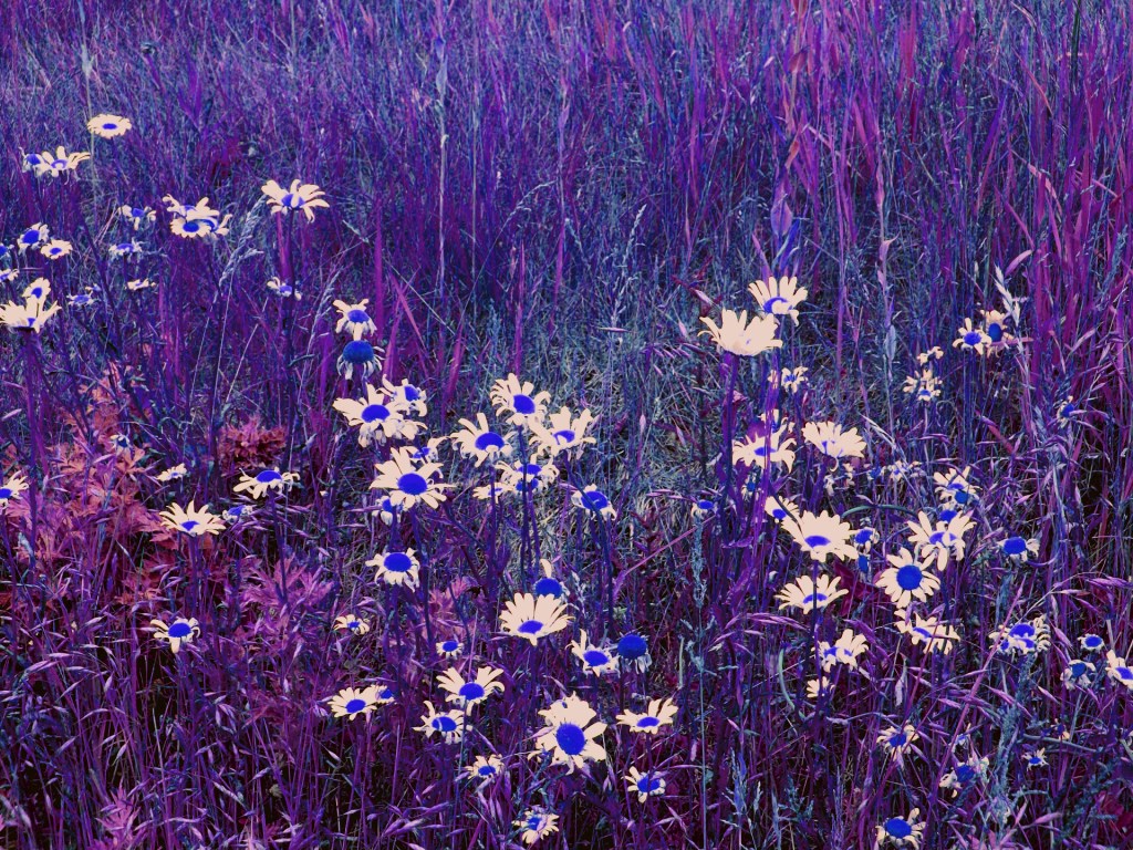 Scrutinizing the Spectrum of Precarious Pleasures, mirrored blue colored flower petals